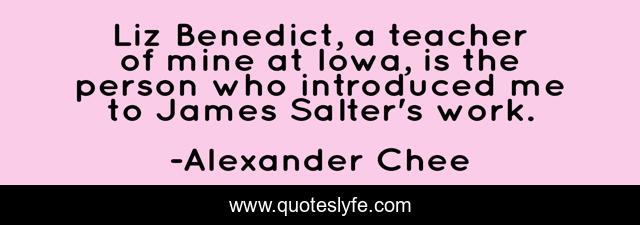 This page presents the quote "Liz Benedict, a teacher of mine at Iowa, is the person who introduced me to James Salter's work.". Author of this quote is Alexander Chee. This quote is about me, person, work,.