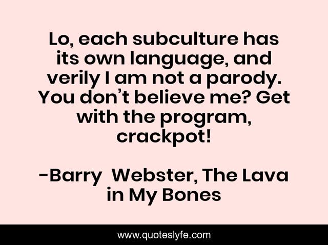 This page presents the quote "Lo, each subculture has its own language, and verily I am not a parody. You don’t believe me? Get with the program, crackpot!". Author of this quote is Barry Webster, The Lava in My Bones. This quote is about subculture, language,.