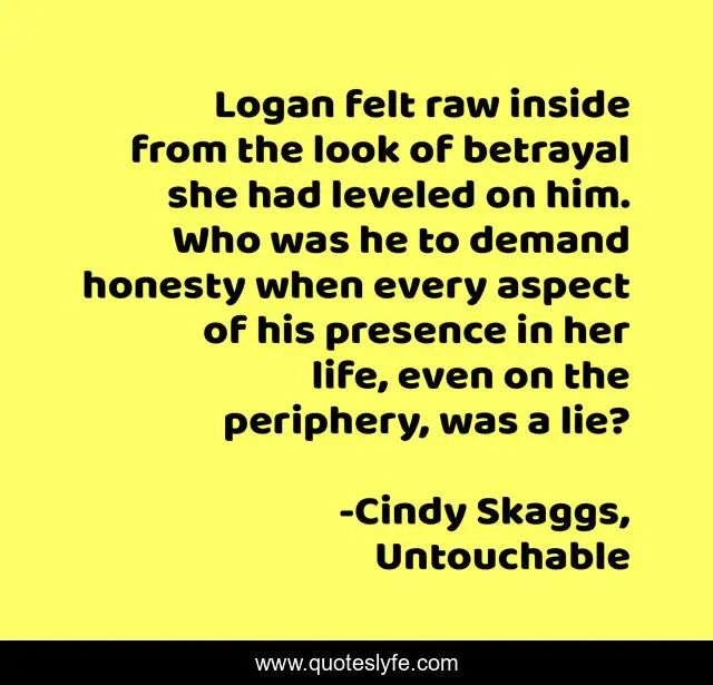 This page presents the quote "Logan felt raw inside from the look of betrayal she had leveled on him. Who was he to demand honesty when every aspect of his presence in her life, even on the periphery, was a lie?". Author of this quote is Cindy Skaggs, Untouchable. This quote is about cindy-skaggs, quote, untouchable,.