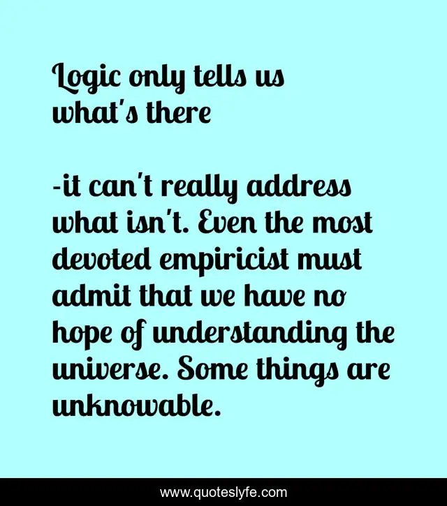 "it can't really address what isn't. Even the most devoted empiricist must admit that we have no hope of understanding the universe. Some things are unknowable. Quotes." Quoteslyfe.com, 2025. Fri. 05 Dec. 2025. <https://www.quoteslyfe.com/quote/Logic-only-tells-us-what-s-there-26043>.