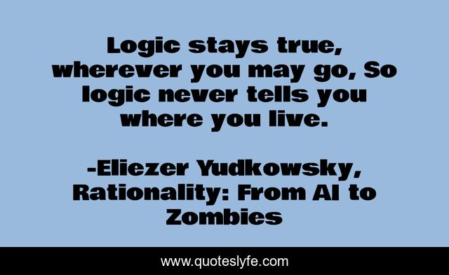 This page presents the quote "Logic stays true, wherever you may go, So logic never tells you where you live.". Author of this quote is Eliezer Yudkowsky, Rationality: From AI to Zombies. This quote is about evidence, rationality, logic,.