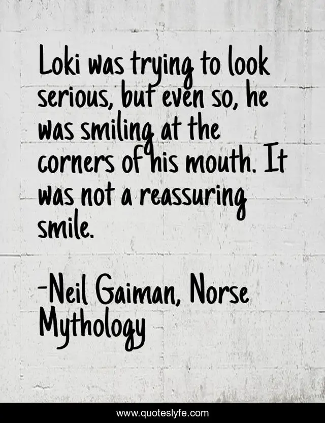 This page presents the quote "Loki was trying to look serious, but even so, he was smiling at the corners of his mouth. It was not a reassuring smile.". Author of this quote is Neil Gaiman, Norse Mythology. This quote is about reassuring, loki, mischievous, serious, smile, mouth, happiness,.