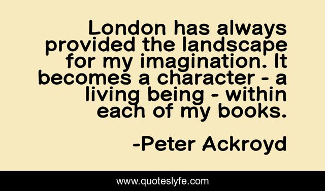 This page presents the quote "London has always provided the landscape for my imagination. It becomes a character - a living being - within each of my books.". Author of this quote is Peter Ackroyd. This quote is about living, character, landscape,.
