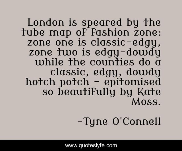 This page presents the quote "London is speared by the tube map of fashion zone: zone one is classic-edgy, zone two is edgy-dowdy while the counties do a classic, edgy, dowdy hotch potch - epitomised so beautifully by Kate Moss.". Author of this quote is Tyne O'Connell. .