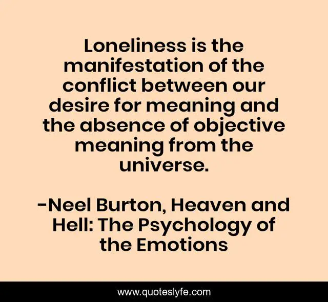 This page presents the quote "Loneliness is the manifestation of the conflict between our desire for meaning and the absence of objective meaning from the universe.". Author of this quote is Neel Burton, Heaven and Hell: The Psychology of the Emotions. This quote is about philosophy, psychology, existentialism, loneliness, solitude, emotions, meaning,.