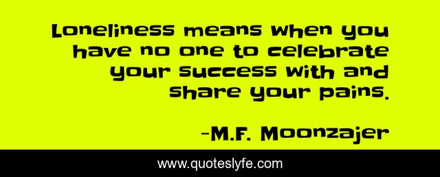 This page presents the quote "Loneliness means when you have no one to celebrate your success with and share your pains.". Author of this quote is M.F. Moonzajer. This quote is about celebrate, loneliness, share, pains, success,.