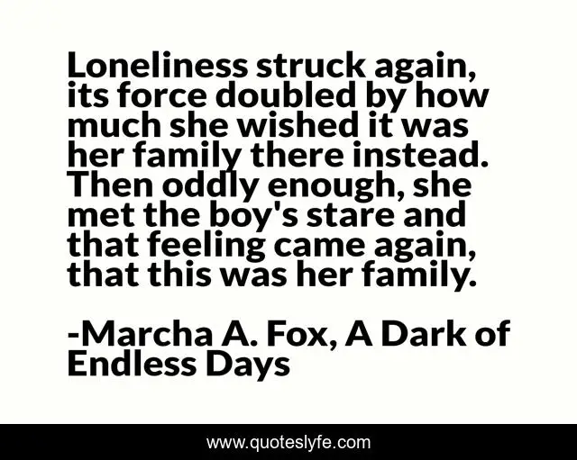 This page presents the quote "Loneliness struck again, its force doubled by how much she wished it was her family there instead. Then oddly enough, she met the boy's stare and that feeling came again, that this was her family.". Author of this quote is Marcha A. Fox, A Dark of Endless Days. This quote is about creena-brightstar, deja-vu, intuition, science-fiction-young-adult, family,.