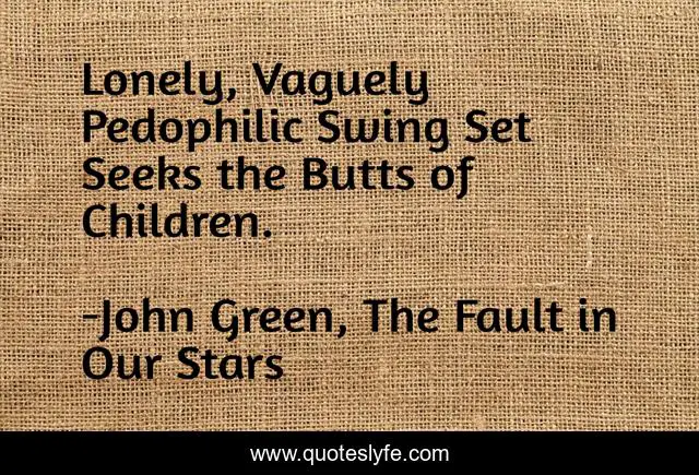"John Green, The Fault in Our Stars Quotes." Quoteslyfe.com, 2025. Sat. 06 Dec. 2025. <https://www.quoteslyfe.com/quote/Lonely-Vaguely-Pedophilic-Swing-Set-Seeks-the-217395>.