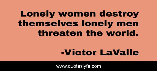 This page presents the quote "Lonely women destroy themselves lonely men threaten the world.". Author of this quote is Victor LaValle. This quote is about world, lonely, men,.