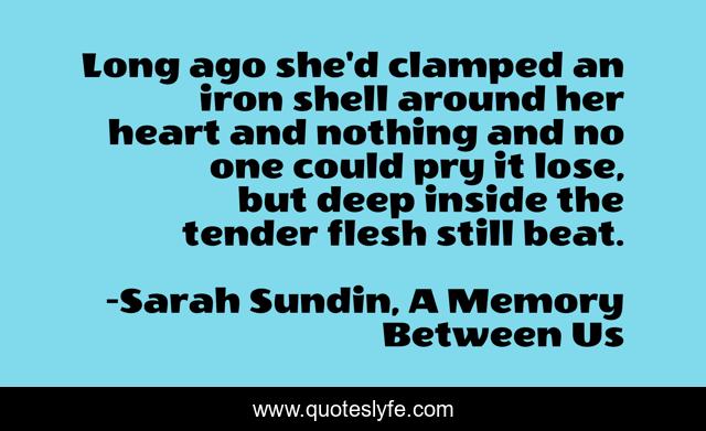 This page presents the quote "Long ago she'd clamped an iron shell around her heart and nothing and no one could pry it lose, but deep inside the tender flesh still beat.". Author of this quote is Sarah Sundin, A Memory Between Us. This quote is about romance, historical-fiction, world-war-2,.