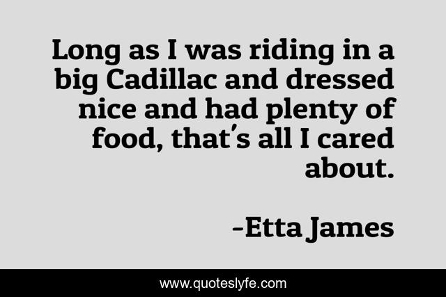 This page presents the quote "Long as I was riding in a big Cadillac and dressed nice and had plenty of food, that's all I cared about.". Author of this quote is Etta James. This quote is about dressed, long, nice,.