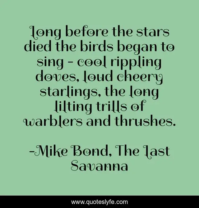 "Mike Bond, The Last Savanna Quotes." Quoteslyfe.com, 2025. Mon. 08 Dec. 2025. <https://www.quoteslyfe.com/quote/Long-before-the-stars-died-the-birds-72773>.