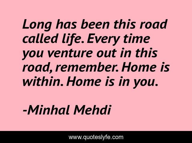 This page presents the quote "Long has been this road called life. Every time you venture out in this road, remember. Home is within. Home is in you.". Author of this quote is Minhal Mehdi. This quote is about life, long, homeless, time, home, road,.