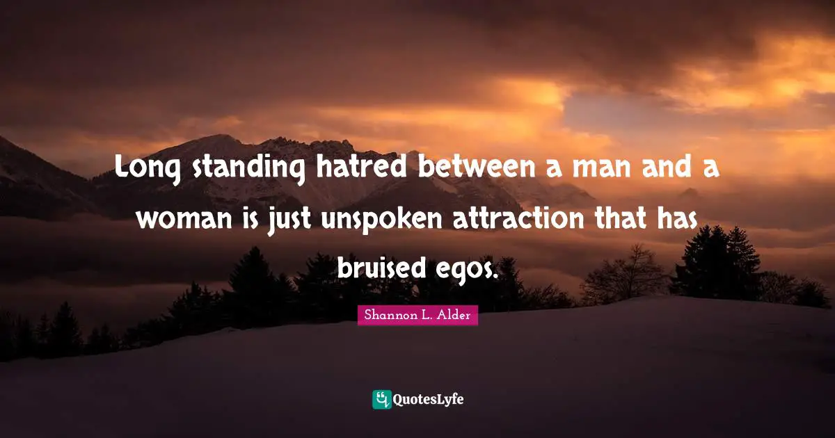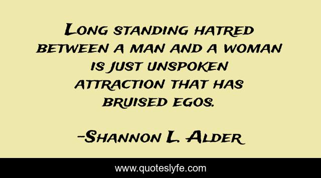 This page presents the quote "Long standing hatred between a man and a woman is just unspoken attraction that has bruised egos.". Author of this quote is Shannon L. Alder. This quote is about commonsense, compatability, banter, attention, bruised-egos, feelings, drama, attraction, egos,.