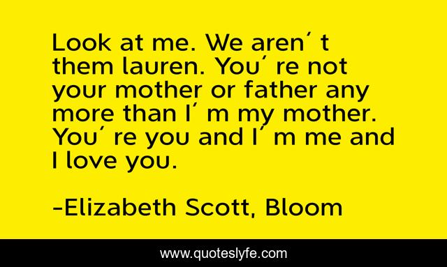 This page presents the quote "Look at me. We aren´t them lauren. You´re not your mother or father any more than I´m my mother. You´re you and I´m me and I love you.". Author of this quote is Elizabeth Scott, Bloom. This quote is about romance, love, affection,.