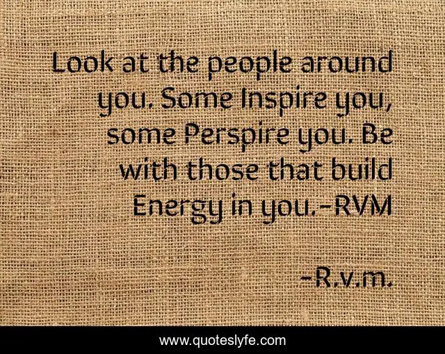 This page presents the quote "Look at the people around you. Some Inspire you, some Perspire you. Be with those that build Energy in you.-RVM". Author of this quote is R.v.m.. This quote is about motivational-inspirational, inspirational, enthusiasm,.
