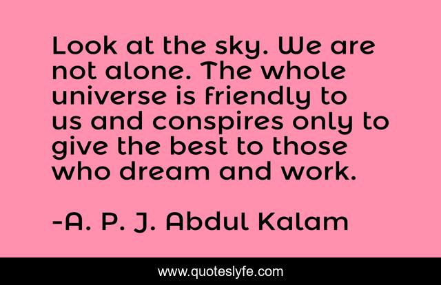 This page presents the quote "Look at the sky. We are not alone. The whole universe is friendly to us and conspires only to give the best to those who dream and work.". Author of this quote is A. P. J. Abdul Kalam. This quote is about alone, sky, best,.