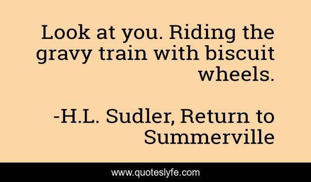 This page presents the quote "Look at you. Riding the gravy train with biscuit wheels.". Author of this quote is H.L. Sudler, Return to Summerville. This quote is about murder, african-american, romance, rehoboth-beach, south-beach, latino, thriller,.