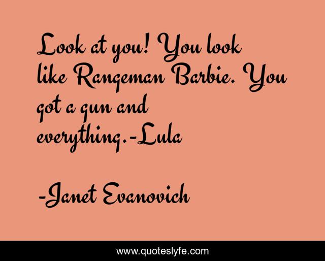 This page presents the quote "Look at you! You look like Rangeman Barbie. You got a gun and everything.-Lula". Author of this quote is Janet Evanovich. .