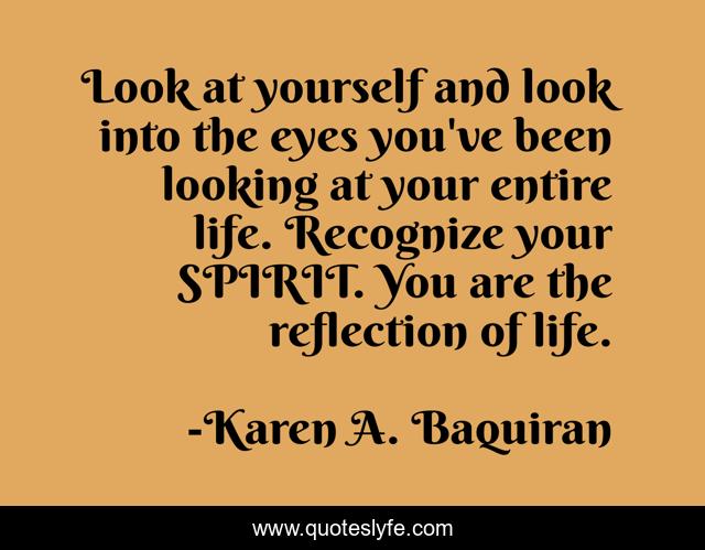 This page presents the quote "Look at yourself and look into the eyes you've been looking at your entire life. Recognize your SPIRIT. You are the reflection of life.". Author of this quote is Karen A. Baquiran. This quote is about life, loveyourself, loveyourselfmovement, spirit,.