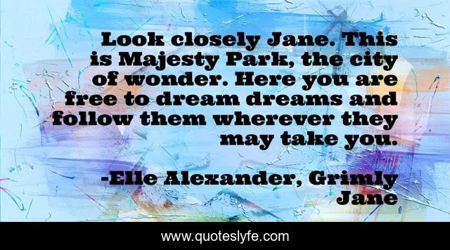 This page presents the quote "Look closely Jane. This is Majesty Park, the city of wonder. Here you are free to dream dreams and follow them wherever they may take you.". Author of this quote is Elle Alexander, Grimly Jane. This quote is about enchantment, magic, dreams, wonder,.