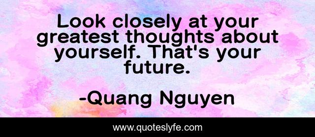 This page presents the quote "Look closely at your greatest thoughts about yourself. That's your future.". Author of this quote is Quang Nguyen. This quote is about confidence, inspirational-motivation, motivational-inspirational, motivational, optimism, optimistic, inspirational, positive, enthusiasm,.