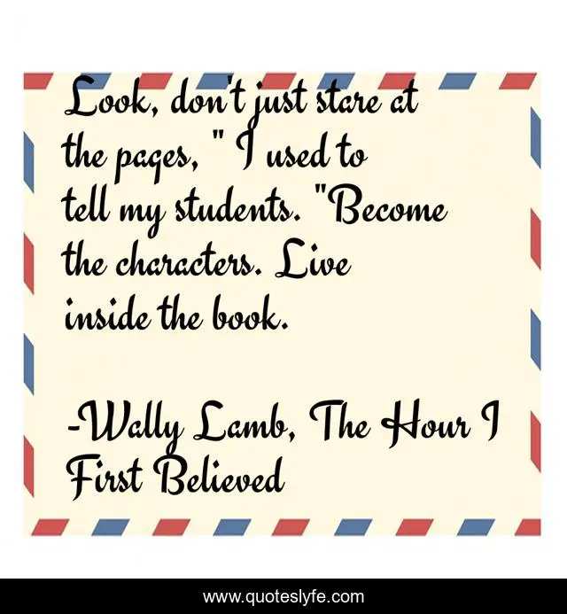 This page presents the quote "Look, don't just stare at the pages, " I used to tell my students. "Become the characters. Live inside the book.". Author of this quote is Wally Lamb, The Hour I First Believed. .
