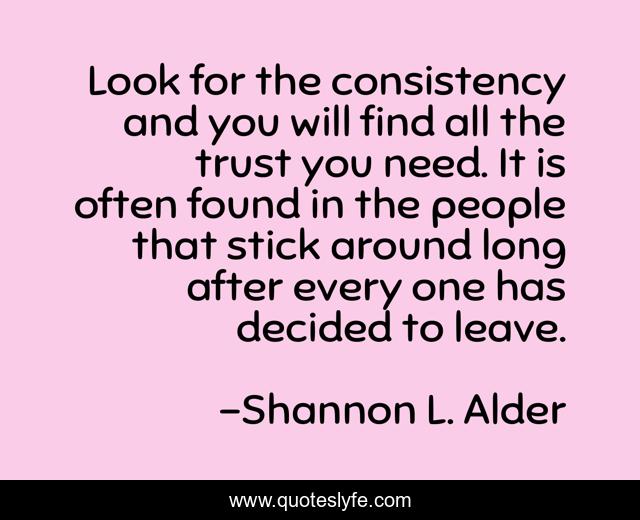 This page presents the quote "Look for the consistency and you will find all the trust you need. It is often found in the people that stick around long after every one has decided to leave.". Author of this quote is Shannon L. Alder. .