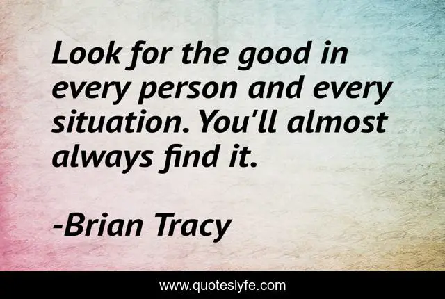 This page presents the quote "Look for the good in every person and every situation. You'll almost always find it.". Author of this quote is Brian Tracy. This quote is about life, wisdom,.
