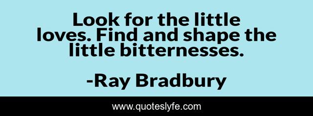 This page presents the quote "Look for the little loves. Find and shape the little bitternesses.". Author of this quote is Ray Bradbury. This quote is about writing-life, inspiration,.