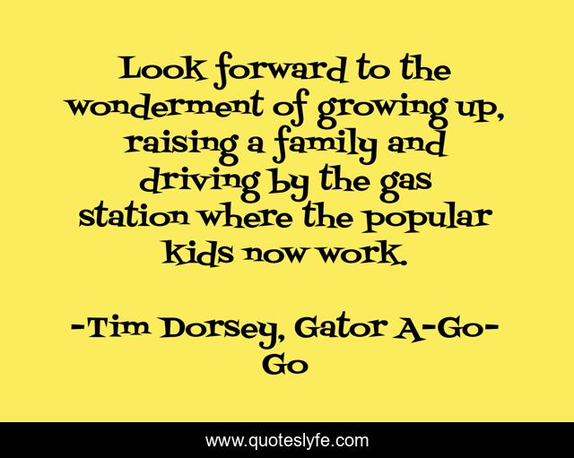 This page presents the quote "Look forward to the wonderment of growing up, raising a family and driving by the gas station where the popular kids now work.". Author of this quote is Tim Dorsey, Gator A-Go-Go. This quote is about popularity-tim-dorsey, growing-up, family,.
