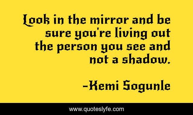 This page presents the quote "Look in the mirror and be sure you're living out the person you see and not a shadow.". Author of this quote is Kemi Sogunle. This quote is about reflection-on-life, living, reality-of-life, life-and-living, truthful-living, change-your-life, reality, living-truthfully, change,.