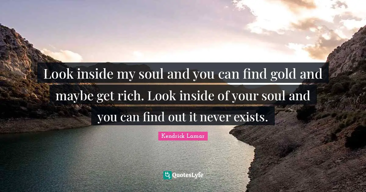 This page presents the quote "Look inside my soul and you can find gold and maybe get rich. Look inside of your soul and you can find out it never exists.". Author of this quote is Kendrick Lamar. This quote is about soul, get rich, my soul, rap, gold, hip hop, your soul,.