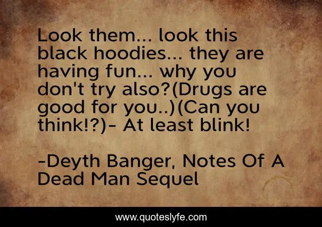 This page presents the quote "Look them... look this black hoodies... they are having fun... why you don't try also?(Drugs are good for you..)(Can you think!?)- At least blink!". Author of this quote is Deyth Banger, Notes Of A Dead Man Sequel. This quote is about for, drugs, ride, drive, blink, twice, rice, think,.
