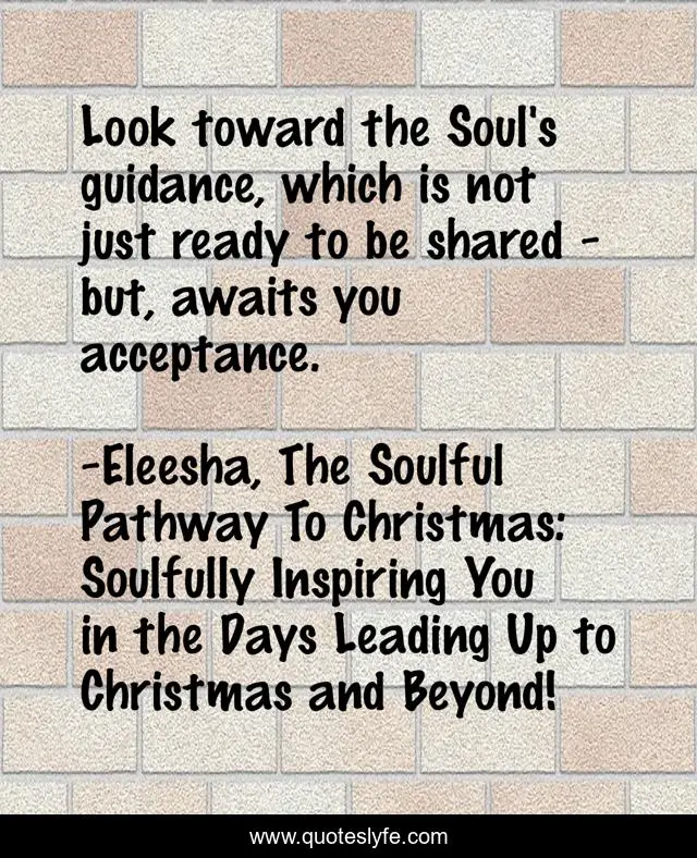 This page presents the quote "Look toward the Soul's guidance, which is not just ready to be shared - but, awaits you acceptance.". Author of this quote is Eleesha, The Soulful Pathway To Christmas: Soulfully Inspiring You in the Days Leading Up to Christmas and Beyond!. This quote is about christmas-spirit, positive, motivational, empowerment, soul, quotes, channeling, inspirational, affirmations,.