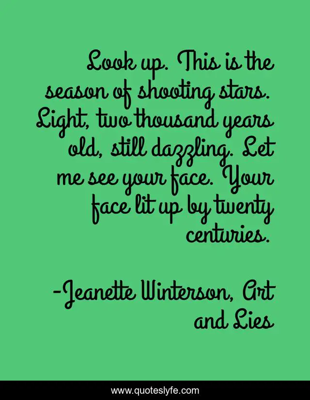 This page presents the quote "Look up. This is the season of shooting stars. Light, two thousand years old, still dazzling. Let me see your face. Your face lit up by twenty centuries.". Author of this quote is Jeanette Winterson, Art and Lies. This quote is about jeanette-winterson, literature, art-and-lies,.