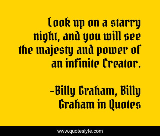 This page presents the quote "Look up on a starry night, and you will see the majesty and power of an infinite Creator.". Author of this quote is Billy Graham, Billy Graham in Quotes. This quote is about creation, billy-graham,.
