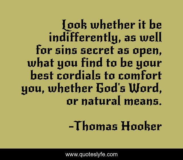 This page presents the quote "Look whether it be indifferently, as well for sins secret as open, what you find to be your best cordials to comfort you, whether God's Word, or natural means.". Author of this quote is Thomas Hooker. This quote is about god, comfort,.