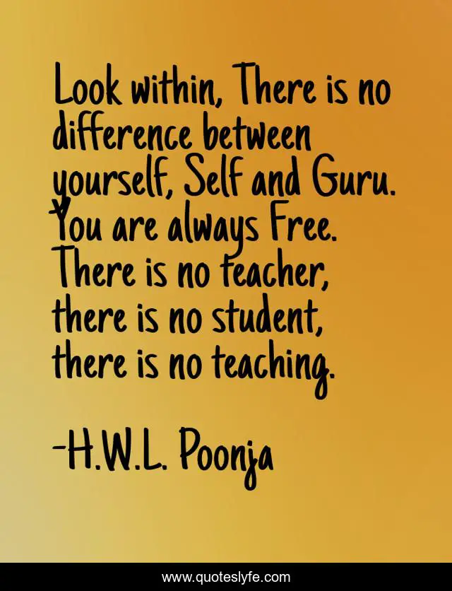 This page presents the quote "Look within, There is no difference between yourself, Self and Guru. You are always Free. There is no teacher, there is no student, there is no teaching.". Author of this quote is H.W.L. Poonja. This quote is about introspection, meditation,.