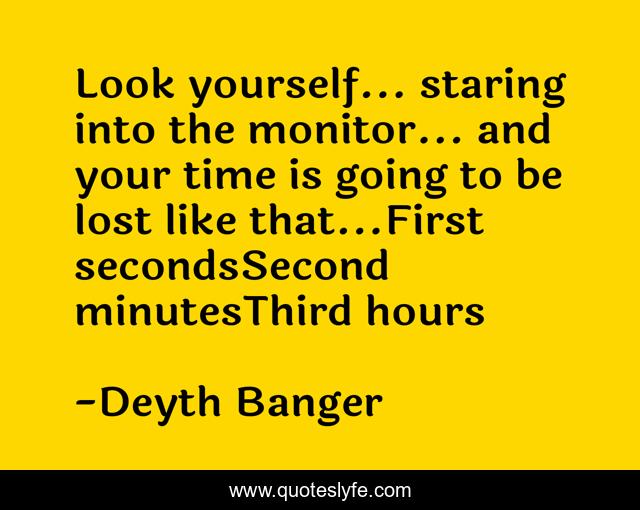 This page presents the quote "Look yourself... staring into the monitor... and your time is going to be lost like that...First secondsSecond minutesThird hours". Author of this quote is Deyth Banger. This quote is about losing, seconds, minutes, time,.