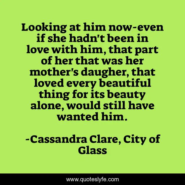 This page presents the quote "Looking at him now-even if she hadn't been in love with him, that part of her that was her mother's daugher, that loved every beautiful thing for its beauty alone, would still have wanted him.". Author of this quote is Cassandra Clare, City of Glass. This quote is about adoration, love, beauty, affection, well-said,.