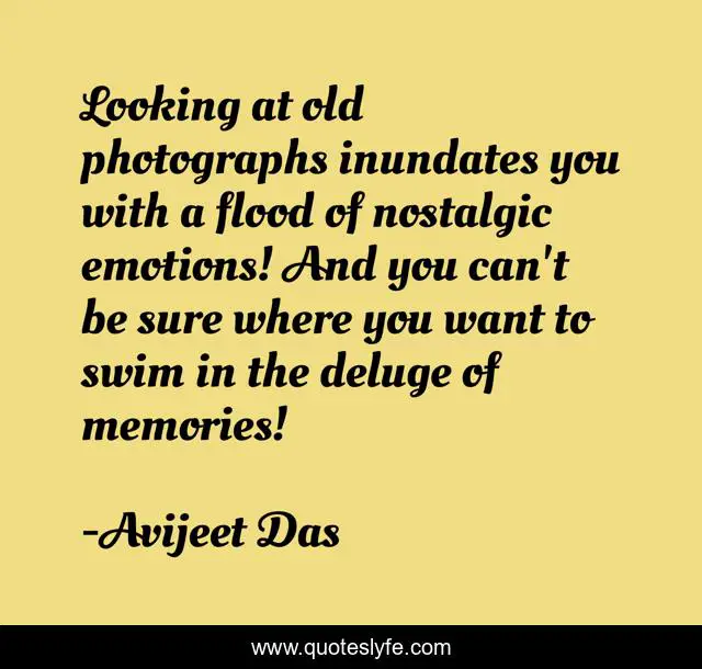 This page presents the quote "Looking at old photographs inundates you with a flood of nostalgic emotions! And you can't be sure where you want to swim in the deluge of memories!". Author of this quote is Avijeet Das. This quote is about photographs, swim, life, deluge, memories, nostalgia, emotions, flood, writers,.