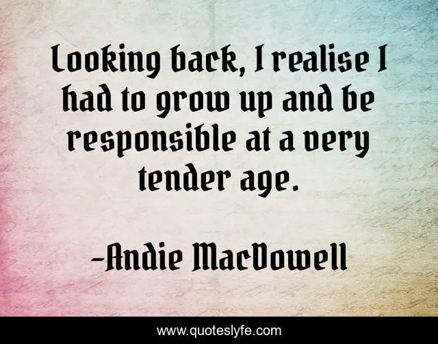 This page presents the quote "Looking back, I realise I had to grow up and be responsible at a very tender age.". Author of this quote is Andie MacDowell. This quote is about looking, looking back, grow,.