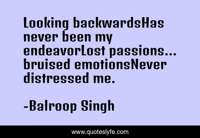 This page presents the quote "Looking backwardsHas never been my endeavorLost passions… bruised emotionsNever distressed me.". Author of this quote is Balroop Singh. This quote is about past, endeavor, distress,.