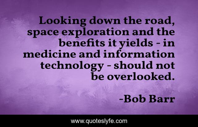 This page presents the quote "Looking down the road, space exploration and the benefits it yields - in medicine and information technology - should not be overlooked.". Author of this quote is Bob Barr. This quote is about technology, road,.
