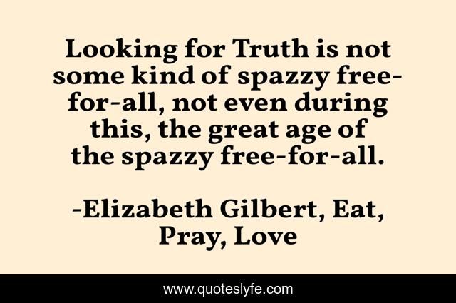 This page presents the quote "Looking for Truth is not some kind of spazzy free-for-all, not even during this, the great age of the spazzy free-for-all.". Author of this quote is Elizabeth Gilbert, Eat, Pray, Love. .