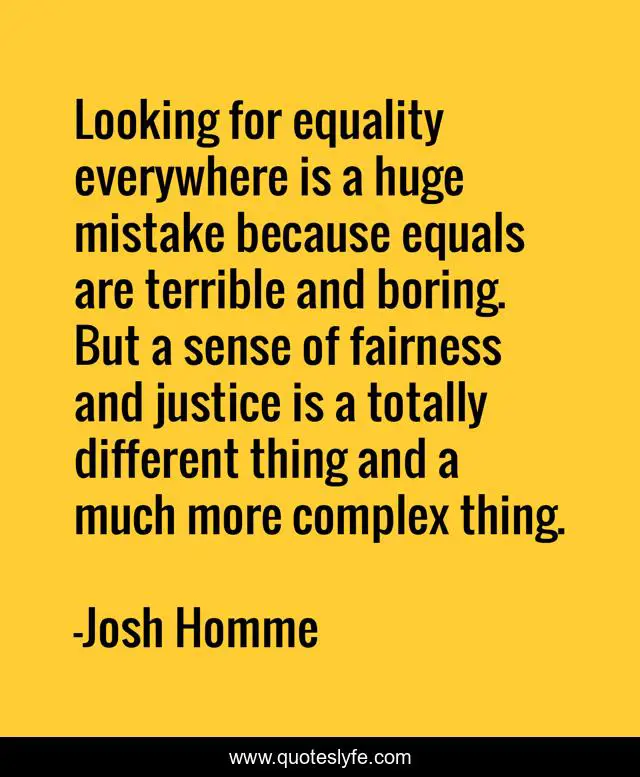 This page presents the quote "Looking for equality everywhere is a huge mistake because equals are terrible and boring. But a sense of fairness and justice is a totally different thing and a much more complex thing.". Author of this quote is Josh Homme. This quote is about justice, looking, mistake,.