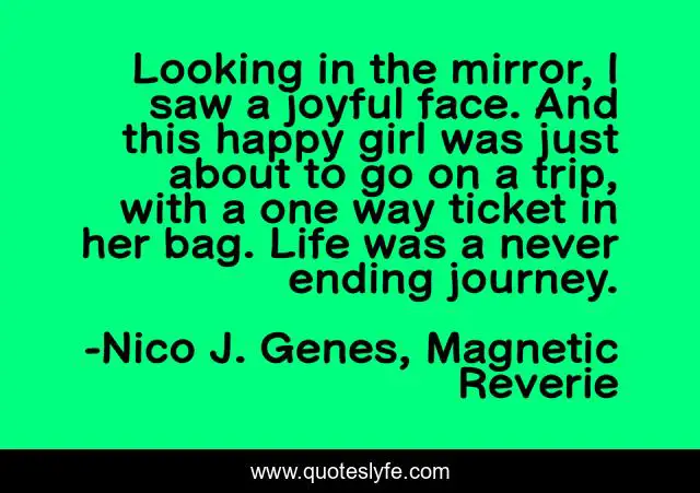 This page presents the quote "Looking in the mirror, I saw a joyful face. And this happy girl was just about to go on a trip, with a one way ticket in her bag. Life was a never ending journey.". Author of this quote is Nico J. Genes, Magnetic Reverie. This quote is about one-way-ticket, joy, journey, girl, trip, journey-of-life, happy,.