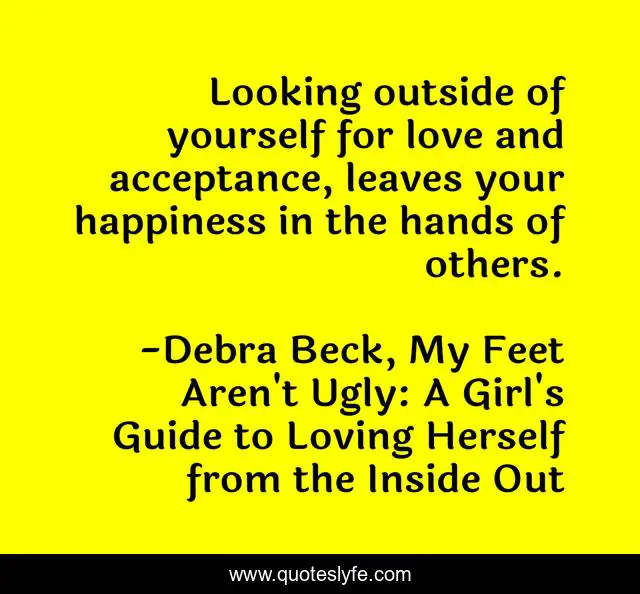 This page presents the quote "Looking outside of yourself for love and acceptance, leaves your happiness in the hands of others.". Author of this quote is Debra Beck, My Feet Aren't Ugly: A Girl's Guide to Loving Herself from the Inside Out. This quote is about loving-yourself, unconditional-love, self-esteem,.