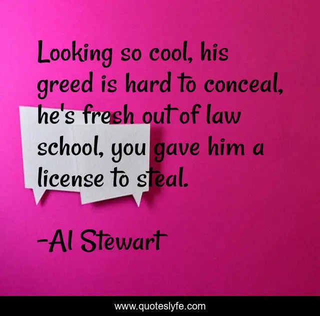 This page presents the quote "Looking so cool, his greed is hard to conceal, he's fresh out of law school, you gave him a license to steal.". Author of this quote is Al Stewart. This quote is about school, law, greed,.